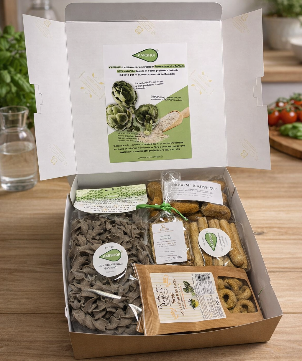 All’interno del box trovi una combinazione equilibrata di prodotti artigianali a base di farina funzionale di carciofo Karshof®, realizzati con ingredienti semplici, lavorazioni attente e senza compromessi sulla qualità. Ogni elemento è studiato per valorizzare il sapore del carciofo, mantenendo leggerezza, digeribilità e carattere.